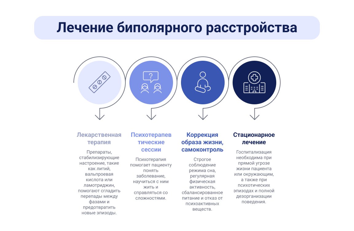 Эффективное лечение биполярного расстройства строится на двух направлениях: правильные медикаменты стабилизируют настроение, а психотерапия помогает справляться с переживаниями.